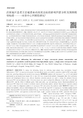 关键词 万古霉素;高原地区;血浆药物谷浓度;影响因素;预测模型
